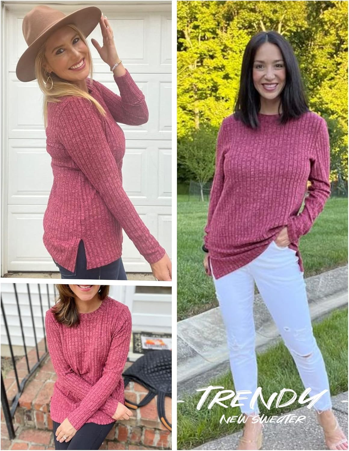 Odosalii Womens Tops Casual Striped Sweaters Crewneck Ribbed Long Sleeve Shirts Side Split Pullover Jumper