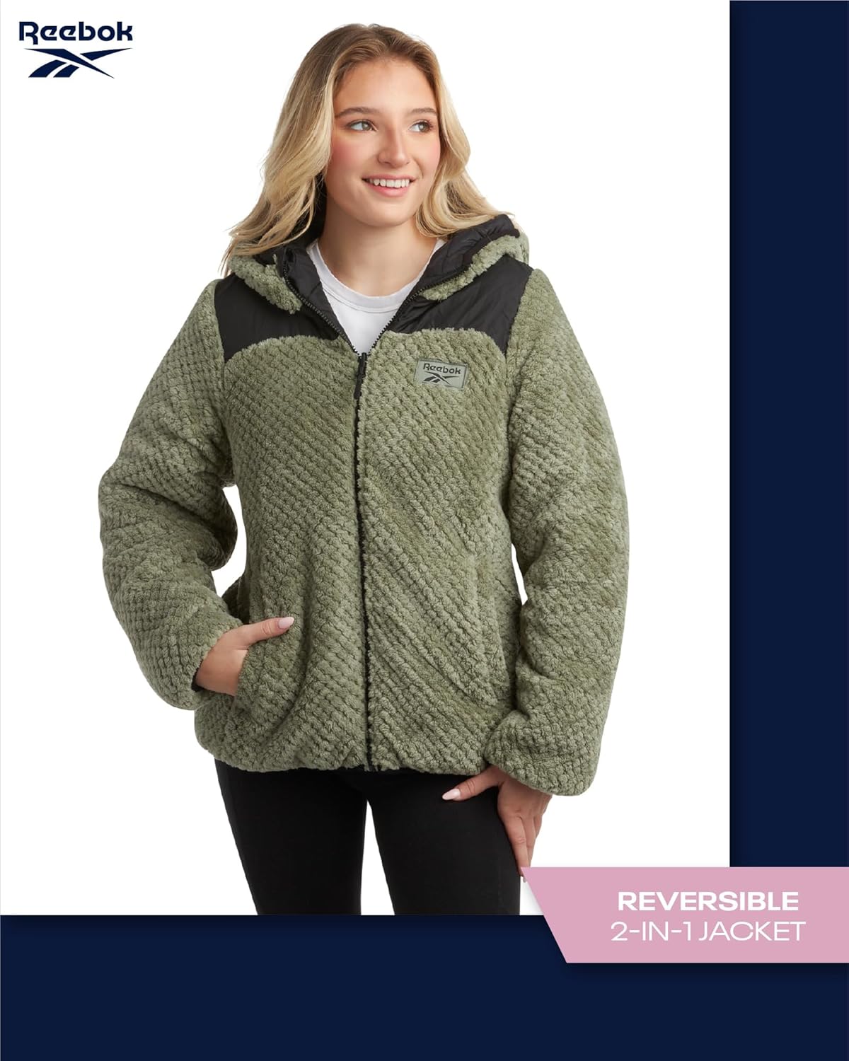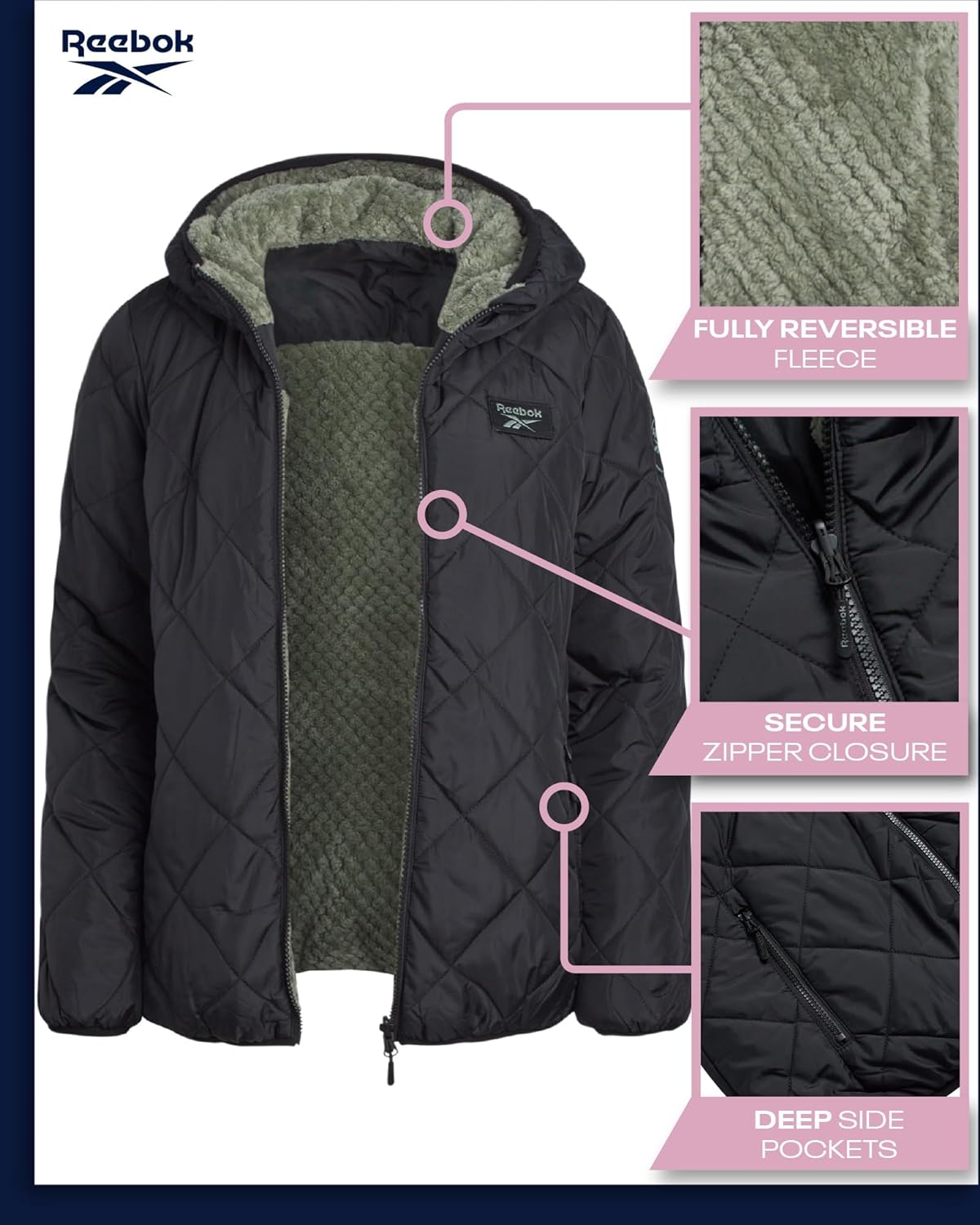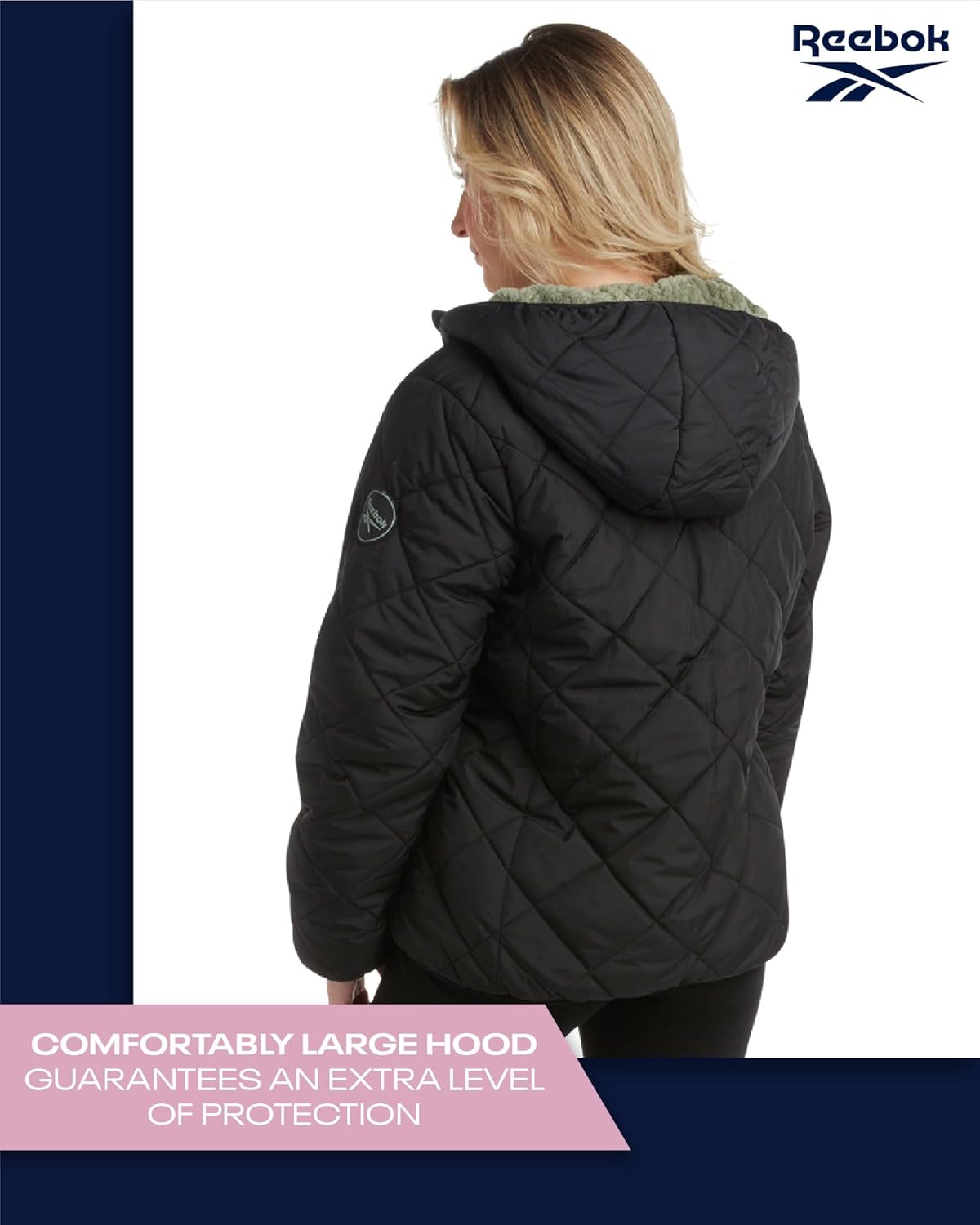 Reebok Women’s Puffer Jacket – Quilted Puffer Reversible to Faux Fleece Jacket – Insulated Winter Jackets for Women (S-XL)